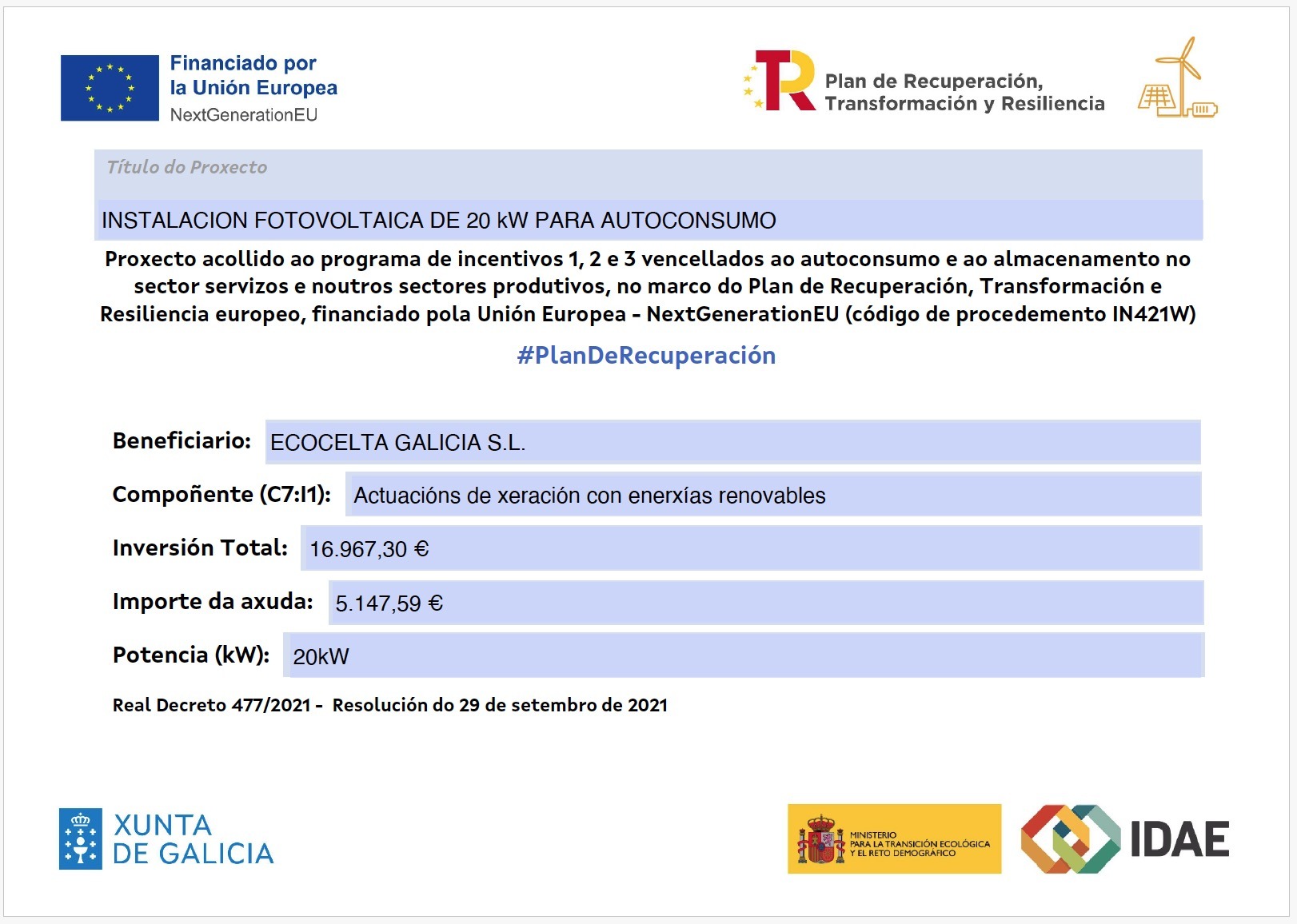 Esta empresa é beneficiaria dunha axuda para o desenvolvemento do proxecto titulado “Sistema modular de vermigestión de purines para su valorización como fertilizante – AGROPURÍN” por un importe total de 123.558,90 euros e ao amparo da Resolución do 3 de febreiro de 2021 (DOG nº 33, do 18 de febreiro de 2021), pola que se establecen as bases reguladoras para a concesión, en réxime de concorrencia competitiva, das axudas para o apoio de proxectos piloto, desenvolvemento de novos produtos, prácticas, procesos e tecnoloxías no ámbito agroforestal, cofinanciadas co Fondo Europeo Agrícola de Desenvolvemento Rural (Feader) no marco do PDR de Galicia 2014-2020, e se convocan para o ano 2021.